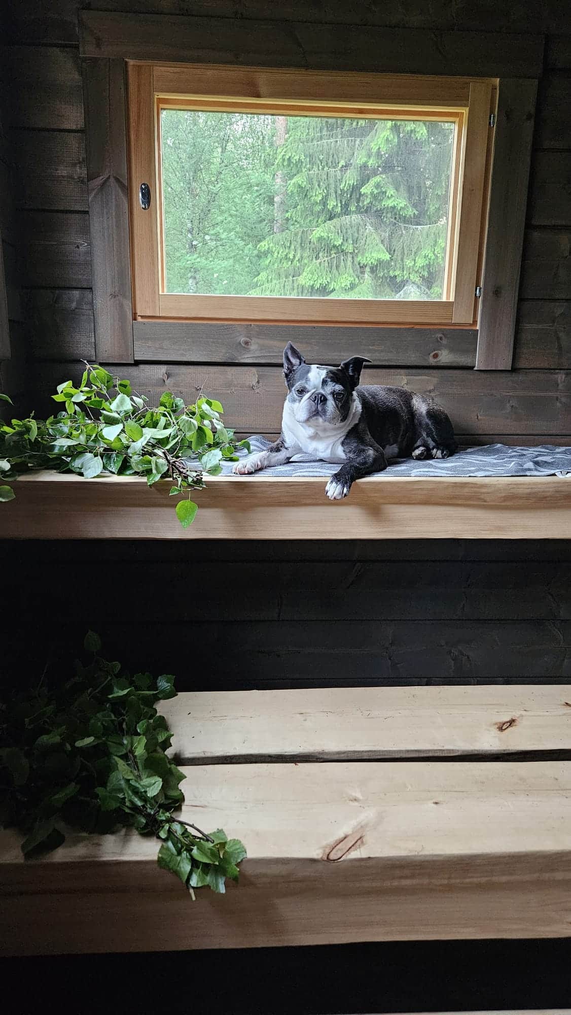Kuva 1)Bostoninterrierimme Laku tykkää saunoa! Se saa aina ensin valita paikkansa ja muut sitten menevät sinne mihin vielä mahtuu (pieni koira osaa viedä yllättävän ison tilan