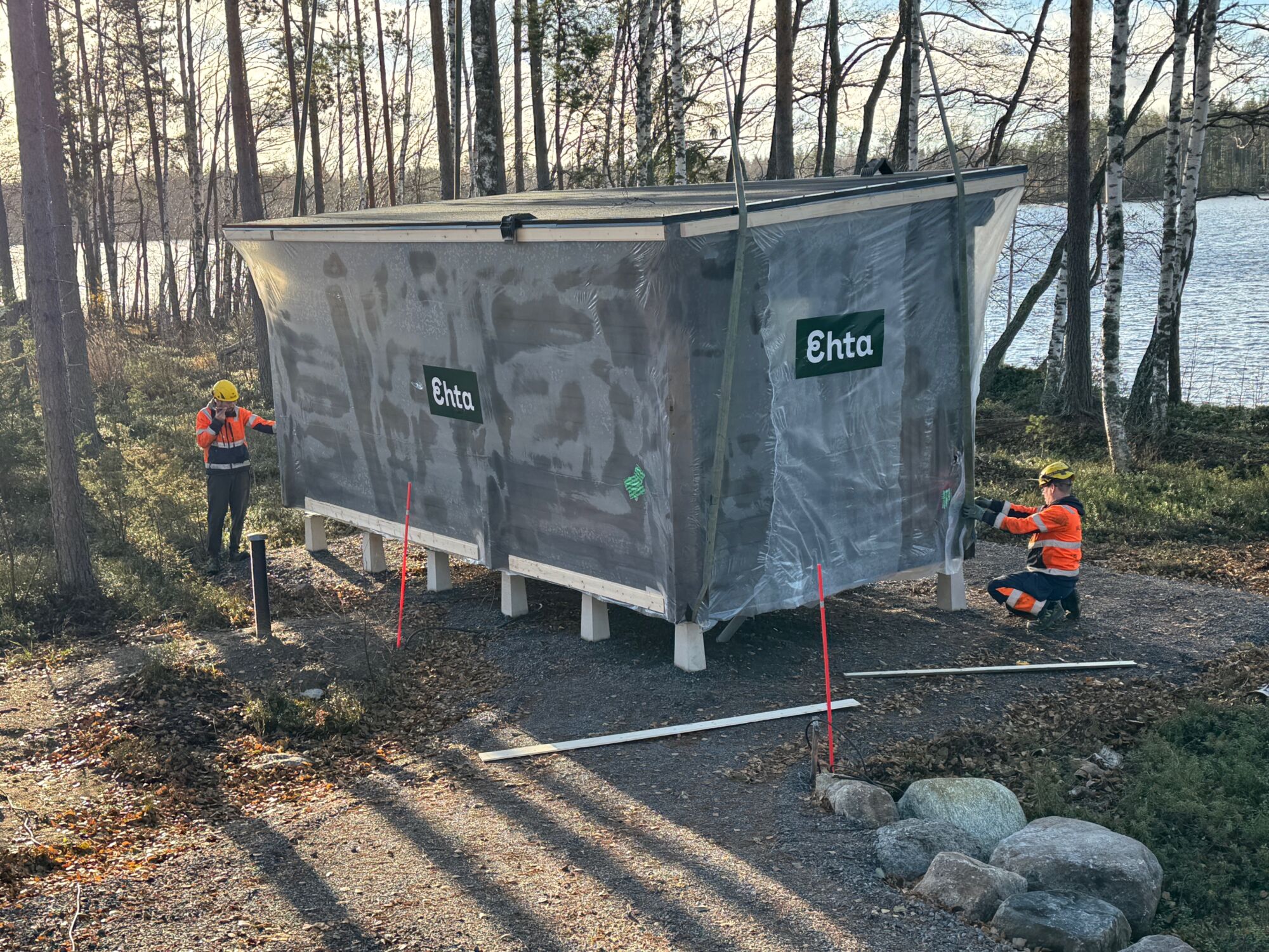Meille paras hetki Ehta-saunan kanssa tähän mennessä on ehdottomasti sen saapuminen mökkirantaan juuri ennen talven ensi lumia lokakuun lopussa tänä syksynä. Saunaa ( pihasauna 16) oli odotettu kesästä saakka joten mahtavaa saada se vihdoin paikoilleen. Iso kiitos Mirjamille!
