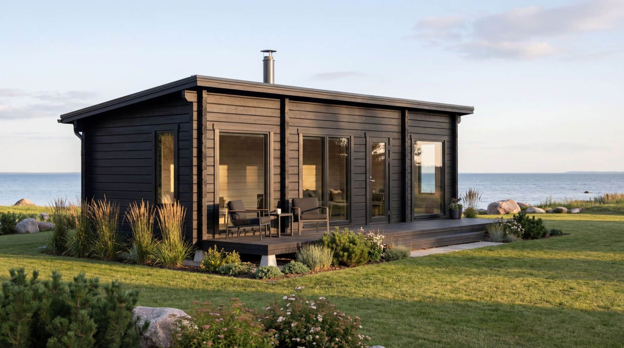 Pieni, moderni musta mökki, jossa on suuret ikkunat ja kuisti, sijaitsee nurmikolla, jota ympäröivät puut ja puutarhakasvit.