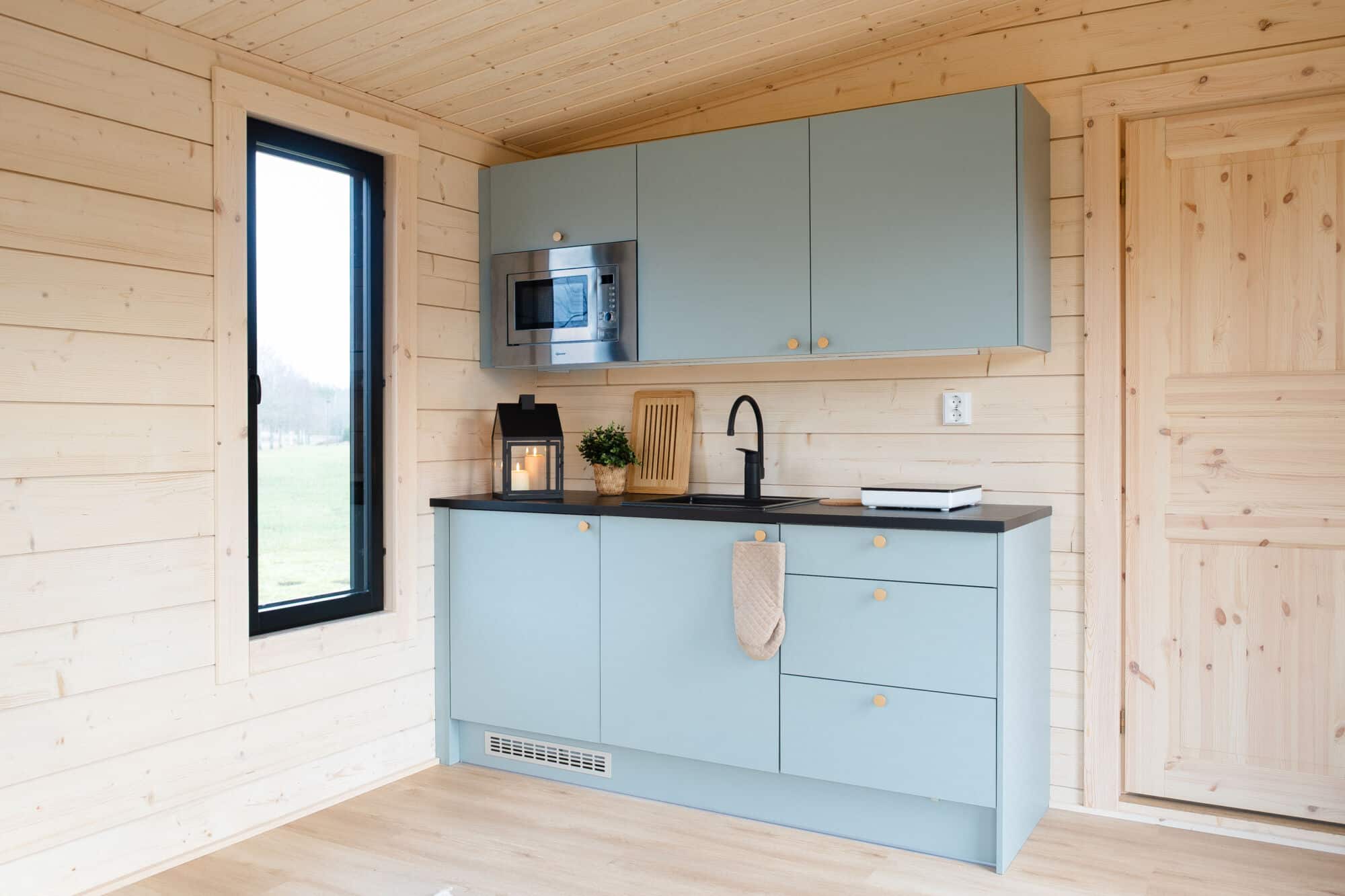 Laadukas hirsimökin keittiö valmiiksi asennettuna kotimaiselta valmistajalta.