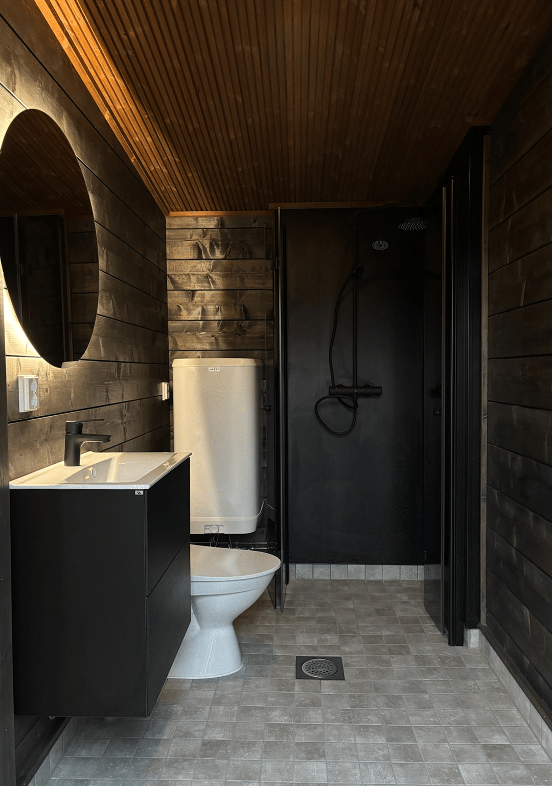 • Löylyhuoneen lattia öljykäsitelty hyvin kosteutta kestäväksi, vesikouru pesuvesien viemäröintiin