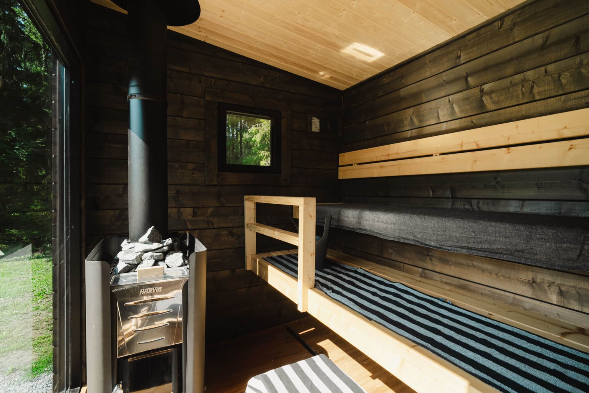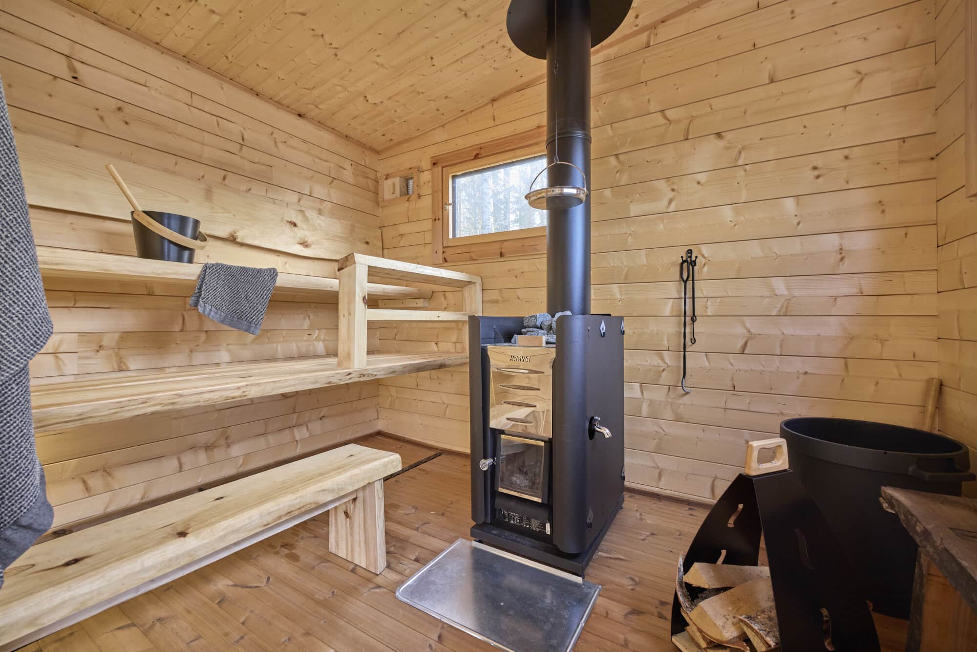Löylyhuoneesta löytyy Harvian kiuas  ja tyylikkäät kuusilankkulauteet.