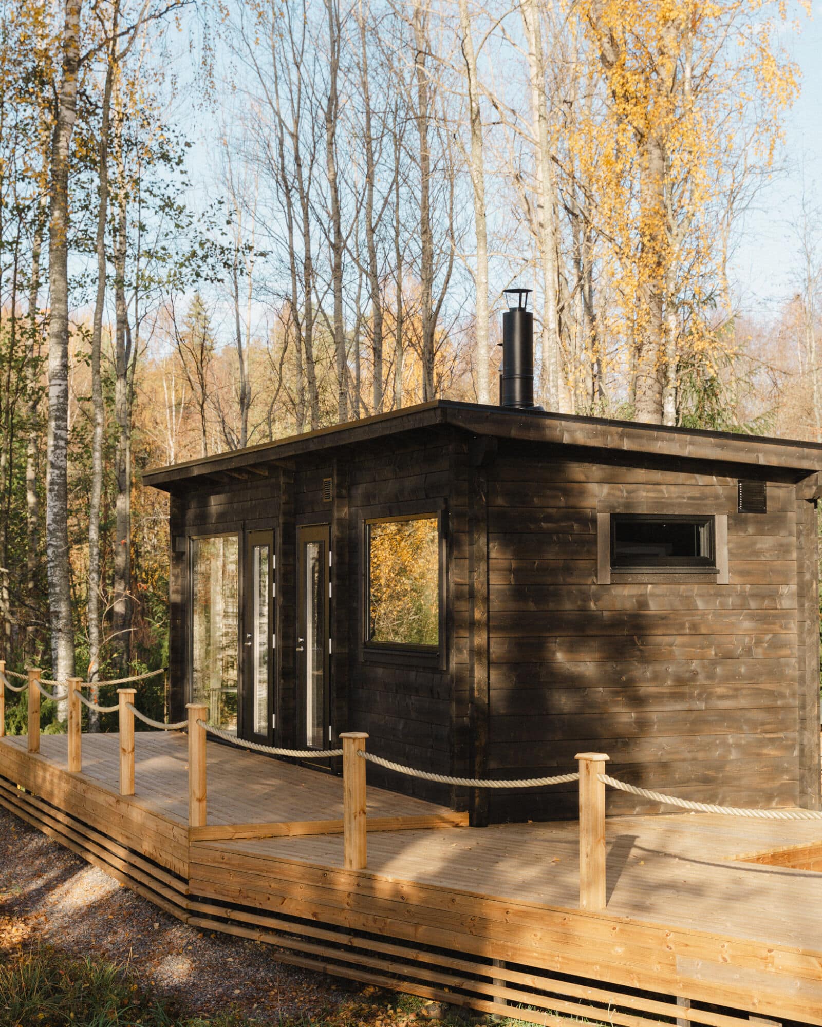 Ehtan moderni, tumma hirrestä valmistettu valmis saunamökki, jossa on maisemaikkunat ja puinen terassi. Terassilla on ulkokalusteita ja edustalla kasvaa iso vaahtera.