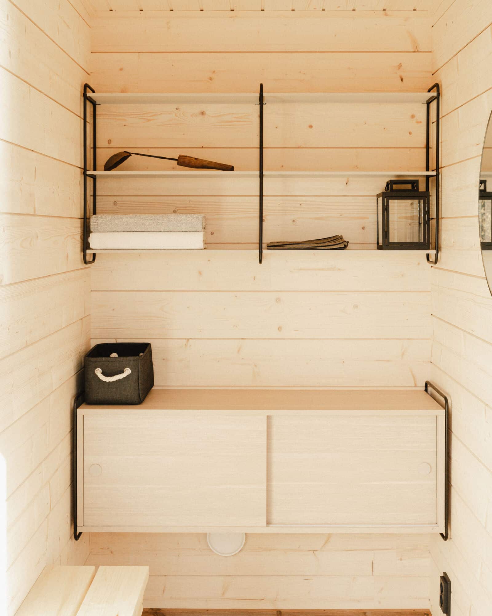 Löylyhuoneen ja oleskelutilan välissä olevan erillisen pukuhuoneen ansioista Saunamökki 20 on ihanteellinen käytettävyydeltään.